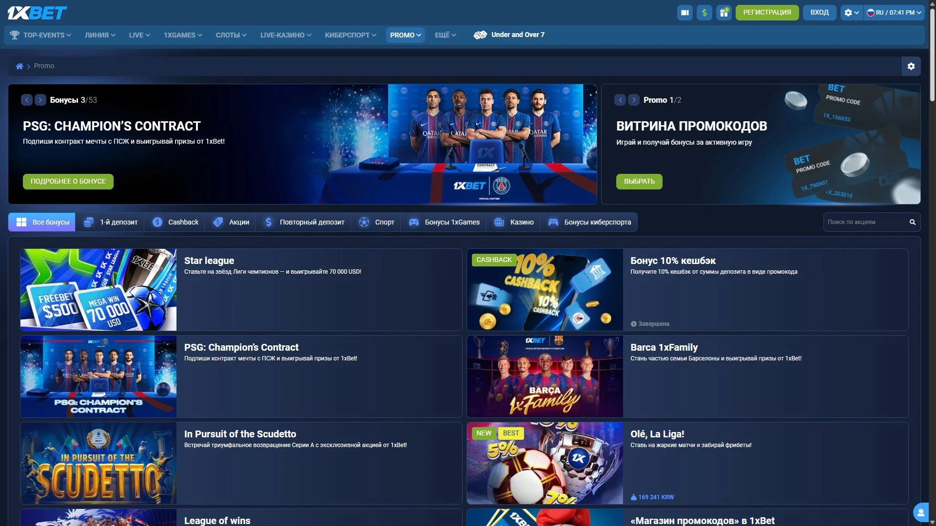 Часть акций фиксированная (приветственные пакеты, кэшбэк, бонус за серию неудачных ставок), другая — сезонная и привязана к турнирам, клубам-партнёрам (PSG, Barcelona, топ-лиги, киберспорт) и праздничным датам. Ниже — краткая схема, как устроена промо-система 1xBet.
