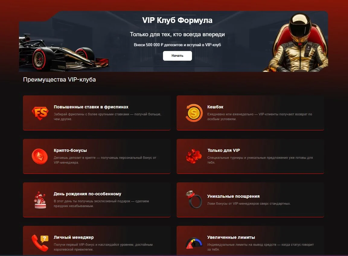 - Высокий порог для получения VIP-статуса — требуется депозит на сумму 500 000 ₽.