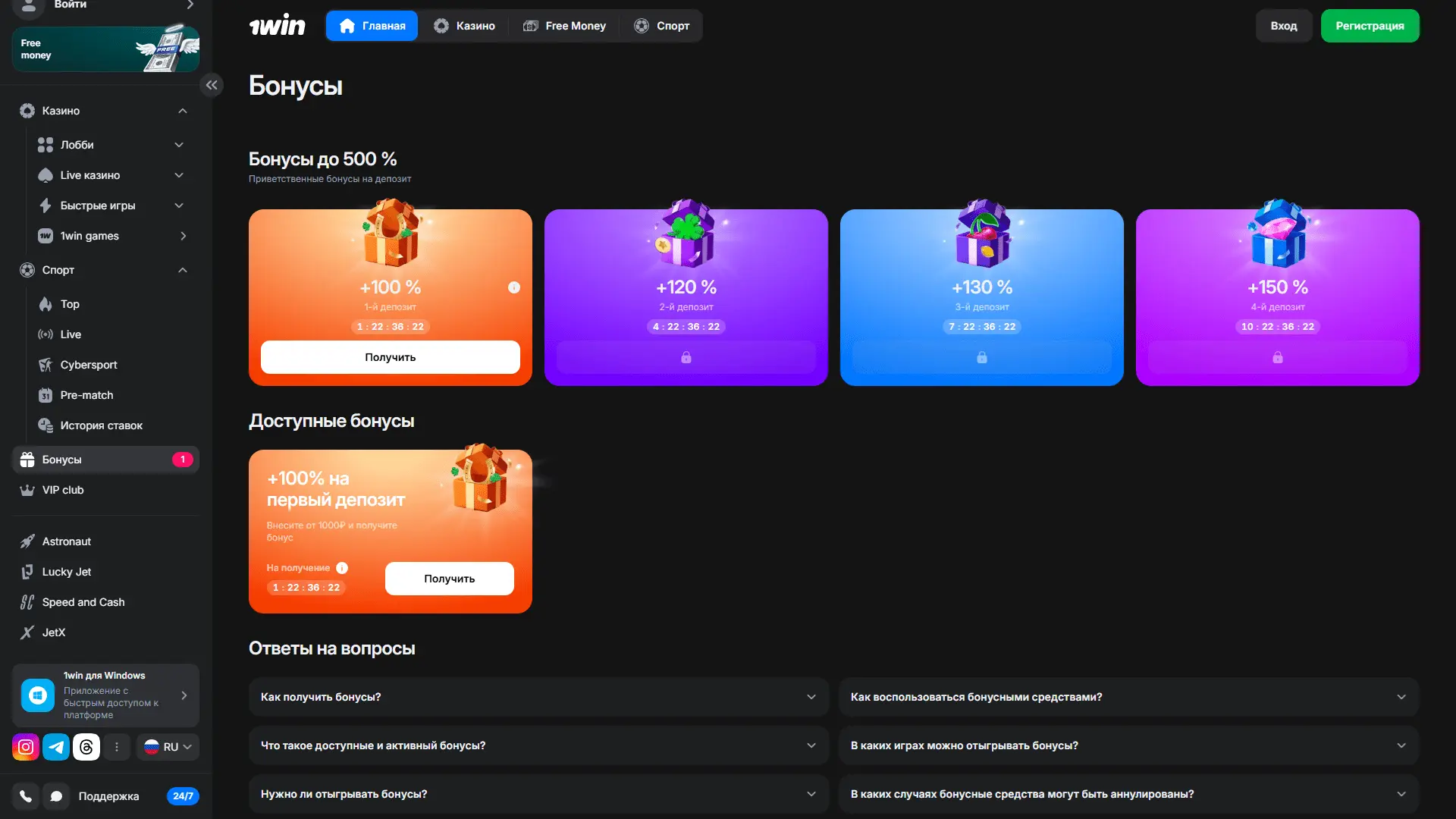 Бонусы 1Win для новых и активных игроков — до 500% и 500 фриспинов