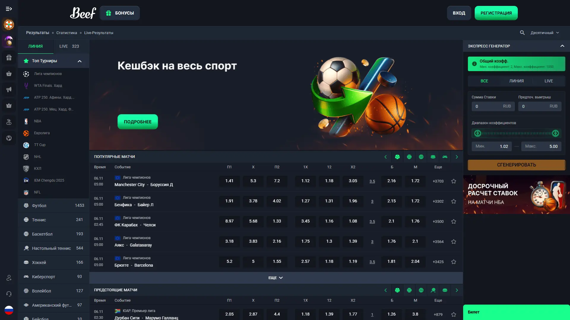 Beef Bet предлагает более 100 маркетов на одно событие: исход, фора, тотал, точный счёт, карточки, угловые и многое другое. Коэффициенты обновляются в реальном времени, а расчёт выигрыша производится моментально после завершения матча. Поддерживаются ординары, экспрессы, системы и функция быстрого кэшаута.