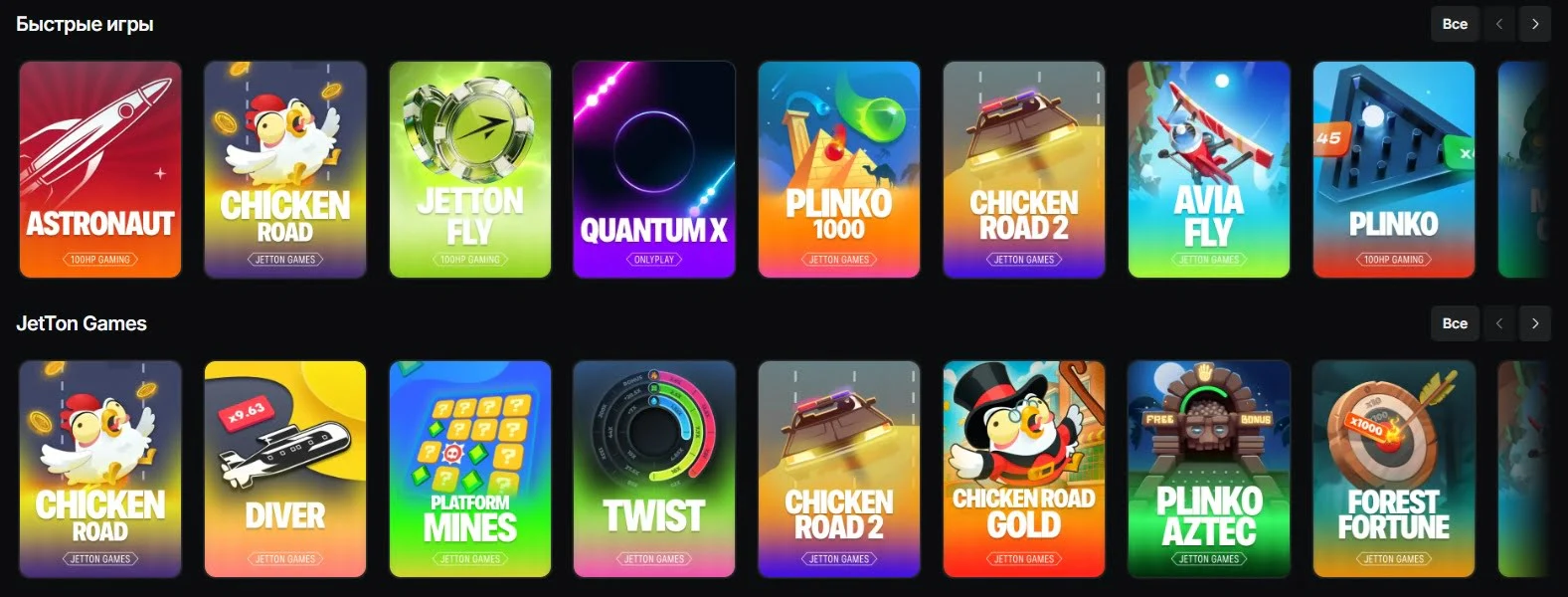 Crash-игры — одно из самых популярных направлений в JetTon. Aviator, JetX, Plinko, Mines и новая серия JetTon Crash+ позволяют получать быстрые коэффициенты при минимальных задержках. Формат особенно востребован у игроков, предпочитающих динамичную игру и моментальные результаты.